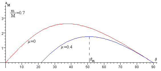 En la figura, se representa de aM en función del ángulo θ para dos valores del coeficiente de rozamiento μ=0, (cuando no hay rozamiento) y μ=0.4. Vemos que aM presenta un máximo para un ángulo θm. Cuando μ≠0, aM es positivo a partir de cierto ángulo θ0. Este ángulo es precisamente aquél tanθ0= μ. Por ejemplo, cuando μ=0.4, θ0=22º. Evidentemente, cuando no hay rozamiento μ=0, θ0=0º.
