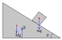 El centro de masas se mueve verticalmente con aceleración Acy. La cuña no se mueve verticalmente, y el bloque se mueve verticalmente hacia abajo con aceleración am·senθ Acy=-m(am·senθ)/(m+M) La segunda ley de Newton para el movimiento vertical del c.m. se escribe R-mg-Mg=(m+M)Acy, de donde podemos despejar la reacción R.