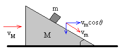 La velocidad de la cuña en este instante es vM=aM·tm=-0.79 m/s La velocidad del bloque respecto de la cuña en dicho instante es vm=am·tm=2.20 m/s La velocidad del bloque respecto de Tierra a partir de dicho instante es Vm=vm·cosθ+vM=1.12 m/s |