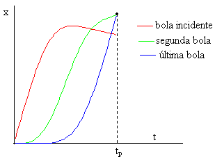 Nota: Para describir las tres etapas se han tomado dos escalas de tiempo. Para describir el movimiento de la primera y última bola se ha tomado un intervalo de tiempo de 10-3 s. Para describir el movimiento de las n-bolas en contacto se ha tomado un intervalo de 10-6 s