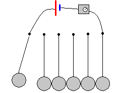 La solución de este sistema de dos ecuaciones con dos incógnitas es v2=0, v1=v que son los datos de partida y v2=v, v1=0 En un choque de dos bolas idénticas, una de las cuales está en reposo, hay un intercambio de momento lineal, la primera se lo cede a la segunda, quedando aquella en reposo. En una sucesión de bolas, la primera choca con la segunda, la segunda bola choca con la tercera, etc. El momento lineal de la bola incidente se transfiere a la siguiente y así sucesivamente. Esto solamente ocurre si las bolas no están en contacto, en caso contrario el comportamiento es complejo.