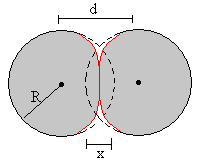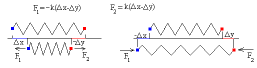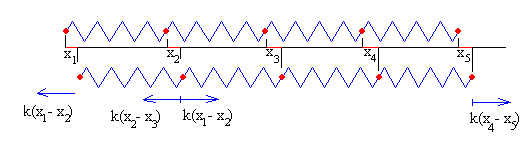 Cadena de n-bolas en contactoEn este apartado, vamos a describir las ecuaciones del movimiento del centro de masas (c.m.) de cada una de las bolas, que forman parte de una cadena de n bolas elásticas en contacto. Consideremos las fuerzas entre dos partículas unida por un muelle elástico. En la parte superior se muestra el muelle sin deformar y en la parte inferior, el muelle comprimido (a la izquierda) y estirado (a la derecha). Las deformaciones del muelles son Δx=x-x0, donde x es la posición de la primera partícula (azul) cuando el muelle se ha deformado, y x0 es la posición de dicha partícula cuando el muelle está sin deformar. Lo mismo cabe decir de Δy. Las fuerza de interacción es el producto de la constante k del muelle por la deformación del muelle o diferencia entre la longitud sin deformar y la longitud del muelle deformado k(|Δx|+|Δy|) . Consideremos un conjunto de cinco partículas unidas por muelles elásticos, en un instante inicial en el que los muelles están sin deformar (arriba), y en un instante tal (abajo) en el que la primera partícula se ha desplazado x1, la segunda x2, la tercera x3, la cuarta x4 y la quinta x5. Las fuerzas sobre cada una de las partículas se indican en la figura, y se señalan los pares de fuerzas: la primera partícula ejerce una fuerza sobre la segunda y la segunda ejerce una fuerza igual y de sentido contrario sobre la primera. Supongamos que los muelles no son lineales, y su comportamiento está de acuerdo a una ley de fuerza cuyo exponente es r=3/2. Las ecuaciones del movimiento de cada una de las partículas son
