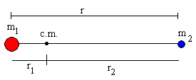 La posición del centro de masas está más cerca de la masa mayor. El movimiento de las dos estrellas es equivalente al movimiento de una partícula de masa reducida m , bajo la acción de la fuerza F que describe la interacción mutua, la fuerza de atracción entre dos masas separadas una distancia r=r1+r2