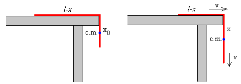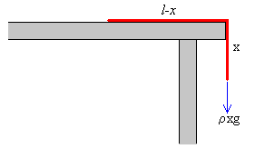 Ecuación del movimientoSea una cuerda uniforme de longitud l, de densidad lineal ρ, que desliza sin rozamiento sobre una mesa horizontal y que cae por uno de sus bordes, tal como se muestra en la figura.