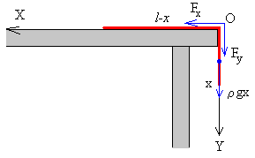 En un determinado instante t, la longitud del segmento vertical de la cuerda que cuelga del borde de la mesa es x. La fuerza que actúa sobre toda la cuerda es el peso de la parte vertical. El peso de la parte horizontal l-x se equilibra con la reacción de la mesa. La segunda ley de Newton se escribe