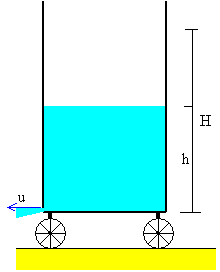 donde u era la velocidad de salida de los gases respecto de cohete, y m la masa total del cohete (recipiente vacío y combustible). En este caso, separamos la masa total en dos partes: la masa m de agua que va disminuyendo y la masa constante M del depósito vacío y la plataforma sobre la que descansa el depósito.