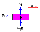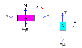 DescripciónEl problema tiene dos partes: Movimiento del sistema formado por los dos bloques unidos por una cuerdaEn la figura, se representan las fuerzas sobre cada unos de los bloques (en color azul) y la aceleración (en color rojo). Sobre el cuerpo A de masa mA actúan dos fuerzas