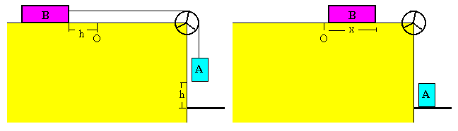 En esta página, se simula otra experiencia que nos permite medir el coeficiente de rozamiento por deslizamiento. Consideremos dos bloques A y B unidos por una cuerda inextensible que pasa por una polea de masa despreciable. Cuando el bloque A desciende una altura h es detenido por una placa y la cuerda deja de tirar del bloque B. El bloque B desliza a lo largo del plano horizontal hasta que se detiene después de desplazarse una distancia x.