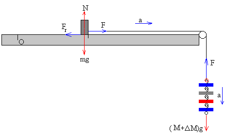 ExperienciaUn bloque de masa m descansa sobre un plano horizontal, el bloque está unido mediante un hilo inextensible y de peso despreciable que pasa por una polea a un platillo sobre el que se depositan pesas. Vamos a estudiar el comportamiento del bloque y a realizar medidas del coeficiente estático y cinético. Medida del coeficiente estático Se van colocando pesas en el platillo y el bloque permanece en reposo. La fuerza de rozamiento vale Fr=Mg donde M es la masa de las pesas que contiene el platillo Cuando va a empezar a deslizar, la fuerza de rozamiento Fr adquiere el valor máximo posible msN=msmg Medida del coeficiente cinético Añadimos una pesa más ΔM y el bloque empieza a deslizar, desplazándose una longitud x en un t. La aceleración es Aplicamos la segunda ley de Newton al movimiento del bloque F-Fr=ma Aplicamos la segunda ley de Newton al movimiento del platillo y las pesas (M+ΔM)g-F=(M+ΔM)a Despejamos el coeficiente cinético μk