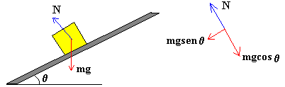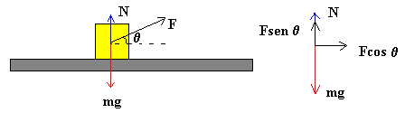 Si ahora, el plano está inclinado un ángulo q , el bloque está en equilibrio en sentido perpendicular al plano inclinado por lo que la fuerza normal N es igual a la componente del peso perpendicular al plano, N=mg·cosq Consideremos de nuevo el bloque sobre la superficie horizontal. Si además atamos una cuerda al bloque que forme un ángulo q con la horizontal, la fuerza normal deja de ser igual al peso. La condición de equilibrio en la dirección perpendicular al plano establece N+ F·senq =mg Fuerza de rozamiento por deslizamientoEn la figura, se muestra un bloque arrastrado por una fuerza F horizontal. Sobre el bloque actúan el peso mg, la fuerza normal N que es igual al peso, y la fuerza de rozamiento Fk entre el bloque y el plano sobre el cual desliza. Si el bloque desliza con velocidad constante la fuerza aplicada F será igual a la fuerza de rozamiento por deslizamiento Fk. Podemos investigar la dependencia de Fk con la fuerza normal N. Veremos que si duplicamos la masa m del bloque que desliza colocando encima de éste otro igual, la fuerza normal N se duplica, la fuerza F con la que tiramos del bloque se duplica y por tanto, Fk se duplica. La fuerza de rozamiento por deslizamiento Fk es proporcional a la fuerza normal N. Fk=mk N La constante de proporcionalidad mk es un número sin dimensiones que se denomina coeficiente de rozamiento cinético. El valor de mk es casi independiente del valor de la velocidad para velocidades relativas pequeñas entre las superficies, y decrece lentamente cuando el valor de la velocidad aumenta.