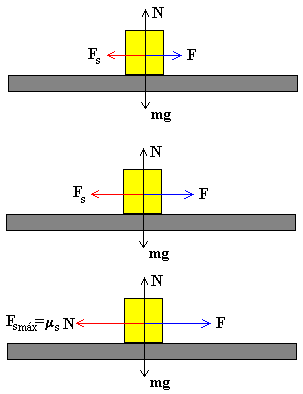 Fuerza de rozamiento estáticoTambién existe una fuerza de rozamiento entre dos objetos que no están en movimiento relativo. Como vemos en la figura, la fuerza F aplicada sobre el bloque aumenta gradualmente, pero el bloque permanece en reposo. Como la aceleración es cero la fuerza aplicada es igual y opuesta a la fuerza de rozamiento Fs. F=Fs La máxima fuerza de rozamiento corresponde al instante en el que el bloque está a punto de deslizar. Fs máx=msN La constante de proporcionalidad ms se denomina coeficiente de rozamiento estático. Los coeficientes estático y cinético dependen de las condiciones de preparación y de la naturaleza de las dos superficies y son casi independientes del área de la superficie de contacto.