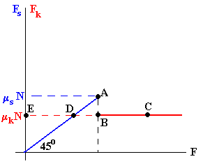 Comportamiento de un cuerpo que descansa sobre un plano horizontalDibujemos una gráfica en la que en el eje horizontal representamos la fuerza F aplicada sobre el bloque y en el eje vertical la fuerza de rozamiento.