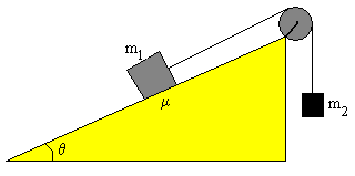 En esta página analizamos detalladamente un problema muy común en un curso de Física cuya solución no se suele presentar de forma completa. Un bloque de masa m1 se sitúa sobre un plano inclinado de ángulo θ. El bloque está conectado a otro bloque de masa m2 que cuelga de su otro extremo mediante una cuerda inextensible que pasa por una polea ideal (de rozamiento y momento de inercia despreciables). Sabiendo que el coeficiente de rozamiento entre el bloque de masa m1 y el plano inclinado es μ, estudiar el movimiento del sistema. Por razón de simplicidad, supondremos que los coeficientes de rozamiento estático y cinético tienen el mismo valor μ.