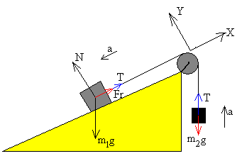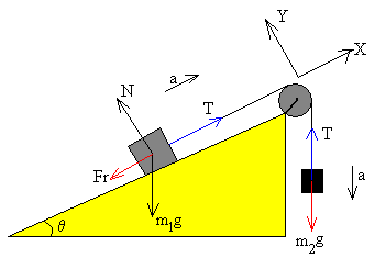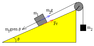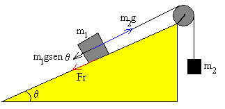 Si m2g> m1gsenθ entonces m2g- m1gsenθ-Fr=0 (1)