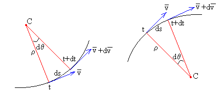 En el intervalo de tiempo comprendido entre t y t+dt, la dirección del vector velocidad cambia un ángulo dθ, que es el ángulo entre las tangentes o entre las normales. El móvil se desplaza en este intervalo de tiempo un arco ds=ρ·dθ, tal como se aprecia en la figura.