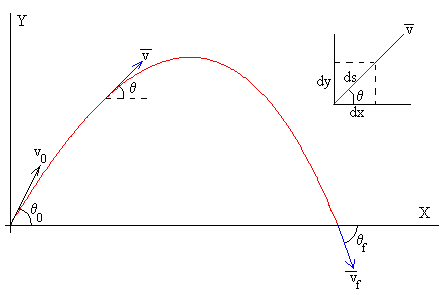 Conocido el ángulo final θf se calcula el alcance x y el tiempo de vuelo t, resolviendo numéricamente las integrales
