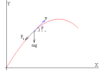 Las ecuaciones del movimiento del cuerpo serán por tanto. Este sistema de ecuaciones diferenciales acopladas se resuelven aplicando procedimientos numéricos, por ejemplo, el método de Runge-Kutta. Las condiciones iniciales son las misma que en la sección anterior t=0, v0x=v0·cosq , v0y=v0·senq , x=0, y=0