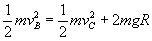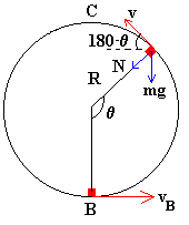 Ahora bien, si la velocidad de la partícula en la posición C es inferior a un valor mínimo, no describirá el bucle. De las ecuaciones de la dinámica del movimiento circular tenemos que Siendo NC la fuerza normal en C, o fuerza que ejerce el raíl sobre la partícula en dicha posición. La velocidad mínima se obtiene cuando NC=0.