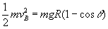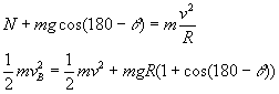 La partícula deja de tener contacto con el bucle en el instante en el que la fuerza normal es cero, N=0. Por lo que En dicho instante, la partícula se mueve bajo la única fuerza de su propio peso describiendo un movimiento curvilíneo bajo la aceleración constante de la gravedad o un tiro parabólico. Situamos los ejes en el centro del bucle. La posición de lanzamiento, tal como se ve en la figura anterior, es x0=R·sen(180-q )