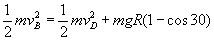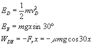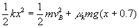 Si comprimimos el muelle una distancia x y luego, lo soltamos en la posición A, podemos calcular la velocidad de la partícula en la entrada B del bucle, aplicando las ecuaciones del balance de energía. En la posición A, la partícula solamente tiene energía potencial elástica Siendo k la constante elástica del muelle, que se transforma en energía cinética en la posición B En el trayecto AB se pierde energía debido al rozamiento WAB=-Fr(x+0.7)=-mkmg(x+0.7) Donde x+0.7 es la distancia entre los puntos A y B. De la ecuación del balance energético WAB=EB-EA obtenemos vB En la sección "Movimiento de la partícula en contacto con el muelle" se proporciona un análisis más detallado del movimiento de la partícula.