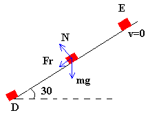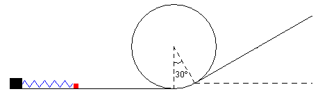 Examinamos las distintas situaciones que se producen cuando se comprime el muelle x. Ejemplo 1 Se comprime el muelle x=0.24 cuando se actúa con el puntero del ratón sobre el pequeño cuadrado de color rojo, que representa una partícula de masa m=1 kg. La velocidad con la que llega al punto B, inicio de la pista circular es La partícula pasa por el punto mas alto C de la pista circular con una velocidad de Regresa al punto B, parte inferior de la pista circular con la misma velocidad vB=5.01 m/s o una velocidad angular de ω=10.02 rad/s. Llega al punto D comienzo de la pista inclinada 30º con una velocidad Calculamos el máximo desplazamiento D de la partícula a lo largo del plano inclinado Ejemplo 2 Se comprime ahora el muelle x=0.2 m La velocidad con la que llega al punto B, inicio de la pista circular es La partícula desliza por la pista circular hasta que la velocidad sea cero o la reacción N se hace cero. En este caso, se analiza la segunda situación Su velocidad v en esta posición es La partícula describe una parábola hasta que choca con la parte inferior de la pista circular. Ejemplo 3 Se comprime ahora el muelle x=0.1 m La velocidad con la que llega al punto B, inicio de la pista circular es La partícula desliza por la pista circular hasta que la velocidad sea cero Retrocede pasando por B, parte inferior de la pista circular con la misma velocidad ya que no hay rozamiento, desliza por la pista horizontal, y puede llegar a A o puede pararse antes. La partícula no llega a la posición A, se para a la distancia Se para a una distancia de 47 cm medido desde B o de 70-47=23 cm medido desde el origen A.