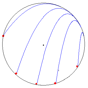 Para analizar este movimiento complejo, situamos el origen en el centro del bucle y medimos los ángulos desde el eje X. El nivel cero de energía potencial lo situamos en el eje X. En la posición angular θ1 la partícula deja de tener contacto con el bucle, la reacción N es nula La ecuación de la dinámica del movimiento circular y el principio de conservación de la energía se escriben Combinando ambas ecuaciones determinamos el valor del ángulo θ1 Una vez que llega P1 describe un movimiento parabólico, la velocidad y la posición de la partícula es Choca con el bucle en el punto P2 que es el punto de intersección entre la parábola y la circunferencia de radio R. Recordando que la ecuación de una circunferencia, cuando su centro está en el origen de coordenadas es x2+y2=R2 Teniendo en cuenta que de la dinámica del movimiento circular Llegamos a la siguiente expresión simplificada El tiempo de vuelo de la partícula hasta que choca con el bucle es La posición del punto de impacto P2 y la velocidad de la partícula son, respectivamente Después del choque, supondremos que se anula la componente normal de la velocidad, y la partícula desliza sobre el bucle con la componente tangencial de la velocidad. La componente normal de la velocidad se calcula mediante el producto escalar r2·v2 El módulo del vector posición r2 del punto P2 es el radio R de la circunferencia La energía final de la partícula en el punto de impacto P2 es La energía en el punto de impacto es menor que la energía de la partícula en el punto de lanzamiento En la figura se muestran, las trayectorias parabólicas seguidas por la partícula, para distintos valores de la velocidad inicial v0 en la parte inferior del bucle.
