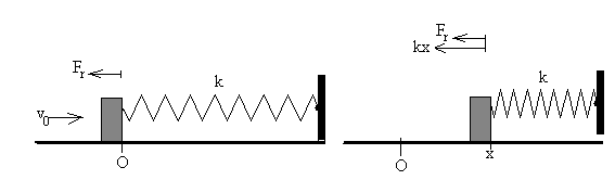 Si la máxima compresión del muelle es x0, la partícula se moverá si kx0> μmg, en caso contrario, permanecerá en equilibrio en dicha posición. La ecuación del movimiento es La solución de esta ecuación diferencial es x=Asen(ωt)+Bcos(ωt)+μg/ω2 Las constantes A y B se determinan a partir de las condiciones iniciales: en el instante t=0, x=x0 y dx/dt=0 Pueden ocurrir dos casos: 1.-Que la partícula se detenga antes de alcanzar el origen 2.-Que la partícula alcance el origen x=0, con velocidad final v La partícula se detiene en el instante t=π/ω, su posición es Para que sobrepase el origen se tiene que cumplir que x0>2μg/ω2 Llegamos a la misma conclusión desde el punto de vista energético. Solamente si la energía almacenada en el muelle es superior al trabajo de la fuerza de rozamiento, la partícula sobrepasa el origen La velocidad con la que llega al origen x=0 es El mismo resultado que se obtiene aplicando el balance energético: El trabajo de la fuerza de rozamiento es igual a diferencia entre la energía final y la energía inicial