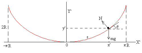 Trasladamos el sistema de ejes al extremo izquierdo de la cicloide x=πR+x'=πR+R(2θ+sen(2θ))=R(2θ+π+sen(2θ)) Haciendo el cambio de parámetro 2θ+π=φ, tenemos de nuevo, las ecuaciones de la cicloide referidas a los ejes X e Y x=R(φ-senφ) Balance energético