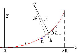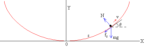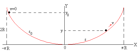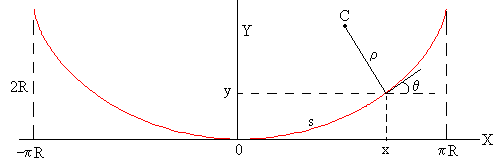 Propiedades geométricas de la cicloideSituamos los ejes en el punto más bajo de la trayectoria de la partícula. Las ecuaciones paramétricas de la cicloide referida a estos ejes son x=R(2θ+sen(2θ)) dado el valor del parámetro θ en el intervalo -π/2≤ θ≤π/2, se determina la posición (x, y) de la partícula. La cicloide es una curva simétrica, las coordenadas de sus extremos son (-πR, 2R), cuando el parámetro θ=-π/2, y (πR, 2R), cuando el parámetro θ=π/2. El parámetro θ, tiene un significado geométrico, es la pendiente de la recta tangente a la curva en la posición (x, y), tal como vemos en la figura. Calculamos ahora la longitud del arco s, entre el origen y el punto de coordenadas (x, y) La longitud de medio arco, es decir, del arco entre el origen (0, 0) y el extremo (πR, 2R) es La trayectoria de un punto situado en el borde de una rueda de radio R que rueda sin deslizar es una cicloide. Sin embargo, el radio de curvatura de la cicloide en la posición (x, y) no es constante sino El radio de curvatura es máximo en el origen ρ=4R, y es mínimo en los extremos de la trayectoria ρ=0.