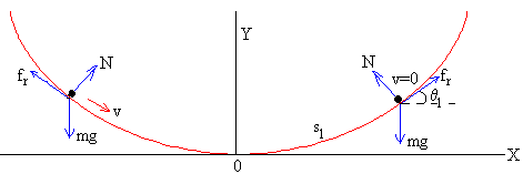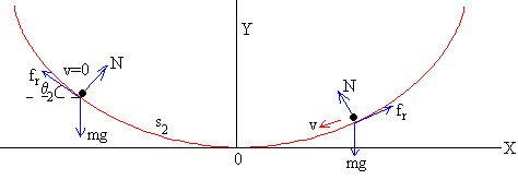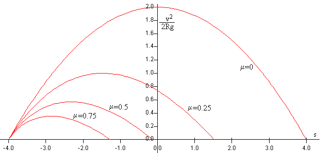 En la figura, se representa v2/(2Rg) en función de la longitud del arco s, para varios valores del coeficiente de rozamiento μ=0.0, μ=0.25, μ=0.5 y μ=0.75. La posición de partida es θ0=-89º, s0≈-4.0. Cuando no hay rozamiento, la posición final cuando la partícula vuelve a pararse es s=4.0. Cuando hay rozamiento la posición final es s<4.0. Sucesivas posiciones de paradaCuando no hay rozamiento, una partícula que parte de la posición θ0<0, alcanza su máxima velocidad cuando pasa por el punto más bajo de la trayectoria y se detiene momentáneamente en la posición -θ0, inicia el camino de vuelta y se detiene en la posición de partida θ0, y así, sucesivamente.