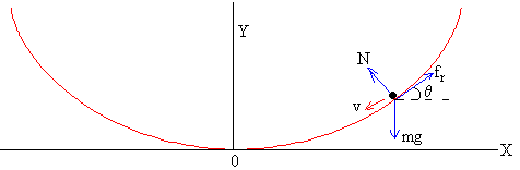 Descomponemos el peso, y escribimos las ecuaciones del movimiento en la dirección tangencial y en la dirección normal mat=-mgsenθ-fr Cuando el cuerpo está deslizando, la fuerza de rozamiento vale fr=μN Teniendo en cuenta las definiciones de aceleración tangencial at y aceleración normal an, y eliminando la reacción N de la superficie en el punto de contacto, expresamos las dos ecuaciones del movimiento en una única ecuación diferencial La velocidad y la aceleración se expresan en términos del parámetro θ, y sus derivadas respecto del tiempo. Se obtiene la ecuación diferencial de segundo orden que se resuelve por procedimientos numéricos con las condiciones iniciales t=0, θ=θ0, dθ/dt=0. Cuando el cuerpo se mueve hacia la izquierda, la fuerza de rozamiento cambia de sentido, en la ecuación diferencial cambiamos +μ por – μ. Solución analíticaLa ecuación del movimiento se puede integrar para obtener una expresión de la velocidad v en función del parámetro θ. Llamando x=v2/(2Rg), nos queda la ecuación diferencial La solución de la ecuación diferencial completa es la suma de la solución de la ecuación diferencial homogénea y de la solución particular: x1=Asen(2θ)+Bcos(2θ)+C Introduciendo la solución particular en la ecuación diferencial obtenemos los valores de los coeficientes A, B y C Buscamos la solución de la ecuación diferencial homogénea Integrando ambos miembros obtenemos lnx=-2μθ+lnD, donde lnD es la constante de integración x2=D·exp(-2μθ) La solución completa de la ecuación diferencial es x=x1+x2 La constante D se determina a partir de las condiciones iniciales, en el instante t=0, θ=θ0, v=0