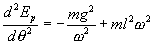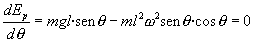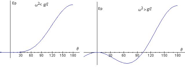 La fuerza centrífuga depende solamente de la distancia x al eje de rotación, es una fuerza conservativa similar a la que ejerce de un muelle elástico. La fuerza que ejerce un muelle elástico es de sentido contrario al desplazamiento F=-kx, su energía potencial es positiva Ep=kx2/2 La fuerza centrífuga tiene el mismo sentido que el desplazamiento F=mw 2·x y su energía potencial será por tanto negativa Ec=- m w 2x2/2. La energía potencial inicial para x=0, se toma como Ec=0. Cuando el péndulo se ha desviado un ángulo q , el desplazamiento horizontal es x= l·senq . La energía potencial total de la partícula será la suma de ambas contribuciones Ep=Eg+Ec. La condición de equilibrio se establece cuando Ep sea un extremo (máximo o mínimo) Que proporciona dos soluciones θ=0 ó π La estabilidad de la solución depende de la derivada segunda.
