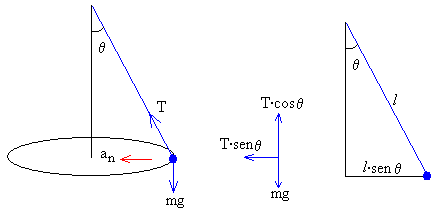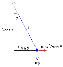Sistema de referencia inercialConsideremos primero la situación más simple. Sustituyamos la varilla por un hilo inextensible y sin peso. Como podemos apreciar en la figura, si la partícula de masa m describe una circunferencia de radio l·senq, las fuerzas que actúan sobre la partícula son: