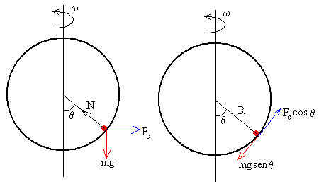 Un dispositivo similarConsideremos un aro de radio R que puede girar alrededor de su diámetro vertical con velocidad angular w. Un punto material de masa m se mueve a lo largo de la circunferencia sin rozamiento. Su posición está dada por el ángulo q tal como se señala en la figura. Las fuerzas que actúan sobre la partícula, cuando estamos situados en el Sistema de Referencia en rotación son: