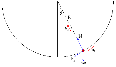 La ecuación del movimiento a lo largo de la dirección tangencial es mat=-mg·senθ-Fr con Fr=μ·N, tenemos la ecuación