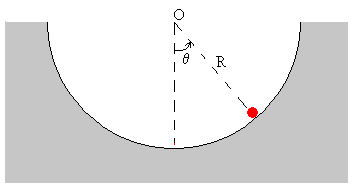 Las posiciones en las que la partícula se detiene momentáneamente v=0, se han marcado en color rojo en la superficie circular cóncava. |