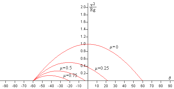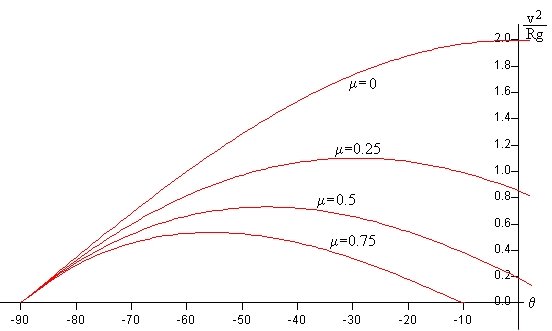 Como podemos comprobar cuando θ=θ0, v=0 En la figura, se representa v2/Rg en función del ángulo θ, para varios valores del coeficiente de rozamiento μ=0.0, μ=0.25, μ=0.5 y μ=0.75. La posición de partida es θ0=-60º.