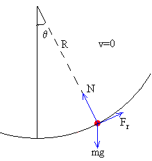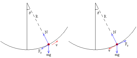 Cuando no hay rozamiento, la posición final cuando la partícula vuelve a pararse es θ=60º. Cuando hay rozamiento la posición final es θ<60º. Ejemplo: Sea coeficiente de rozamiento entre la superficie semiesférica y la partícula es μ=0.25. Si la partícula parte de la posición θ0=-60º=-π/3, calcular la velocidad de la partícula cuando pasa por la posición θ=0. El radio de la superficie semicircular es R=1 m. Si la partícula parte de la posición inicial θ0=-90º=-π/2, la velocidad cuando pasa por la posición más baja θ=0 es Por ejemplo, para μ=0.25, v2/(Rg)=0.853. En la figura, se muestra la v2/(Rg) cuando la partícula pasa por el punto más bajo de la superficie semicircular, para varios valores del coeficiente de rozamiento. Sucesivas posiciones de paradaCuando no hay rozamiento, una partícula que parte de la posición -θ0, alcanza su máxima velocidad cuando pasa por el punto más bajo de la trayectoria y se detiene momentáneamente en la posición θ0, inicia el camino de vuelta y se detiene en la posición de partida -θ0, y así, sucesivamente. Cuando hay rozamiento, la partícula que parte de la posición -θ0, llega hasta la posición θ1, se cumple que θ0>|θ1|. Pueden ocurrir dos casos: