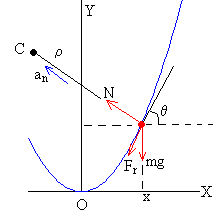 Cuando la partícula en el instante t, se encuentra en la posición x, el vector velocidad v (cuya dirección es tangente a la trayectoria) forma un ángulo θ con el eje X.