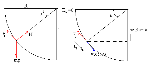 El trabajo de la fuerza de rozamiento es igual a la diferencia entre la energía final y la energía inicial o bien, la suma de la variación de energía cinética más la variación de energía potencial. El trabajo total de la fuerza de rozamiento cuando la partícula describe el cuarto de círculo es Para un cálculo explícito del trabajo de la fuerza de rozamiento véase "Movimiento sobre un cúpula semiesférica con rozamiento" |