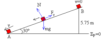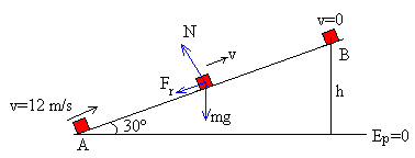 De la ecuación del balance energético W=EB-EA, despejamos x=11.5 m, h=x·sen30º=5.75 m Cuando el cuerpo desciende