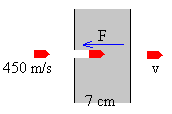 Concepto de energía cinéticaSupongamos que F es la resultante de las fuerzas que actúan sobre una partícula de masa m. El trabajo de dicha fuerza es igual a la diferencia entre el valor final y el valor inicial de la energía cinética de la partícula. En la primera línea hemos aplicado la segunda ley de Newton; la componente tangencial de la fuerza es igual a la masa por la aceleración tangencial. En la segunda línea, la aceleración tangencial at es igual a la derivada del módulo de la velocidad, y el cociente entre el desplazamiento ds y el tiempo dt que tarda en desplazarse es igual a la velocidad v del móvil. Se define energía cinética como la expresión El teorema del trabajo-energía indica que el trabajo de la resultante de las fuerzas que actúa sobre una partícula modifica su energía cinética. Ejemplo: Hallar la velocidad con la que sale una bala después de atravesar una tabla de 7 cm de espesor y que opone una resistencia constante de F=1800 N. La velocidad inicial de la bala es de 450 m/s y su masa es de 15 g. El trabajo realizado por la fuerza F es -1800·0.07=-126 J