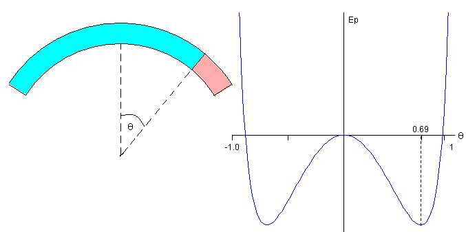En primer lugar, el origen θ es una posición de equilibrio F=0, que puede ser estable o inestable. Por debajo de una cierta temperatura tc es inestable y por encima es estable, lo mismo que ocurre en el modelo simétrico. Calculamos la derivada segunda de la energía potencial En la posición θ=0, la derivada segunda La posición θ=0 pasa de inestable a estable a la temperatura tc para la cual la derivada segunda se hace cero Fijado el valor del parámetro α, se va cambiando el valor de la temperatura t y se anota la posición de equilibrio estable para cada temperatura. Esta posición se calcula resolviendo la ecuación trascendente con F=0. Se representa: