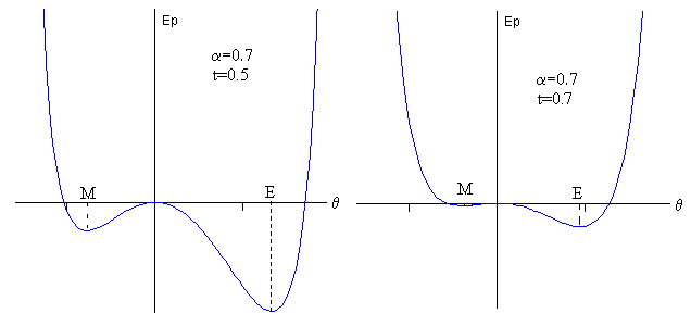 Existen también equilibrios estables a la izquierda del origen, tal como se muestra en la figura Estas posiciones de equilibrio se denominan metaestables. Si nos fijamos en la figura de la derecha, una pequeña perturbación llevará al sistema desde el estado M (un ángulo de equilibrio negativo) al estado E (un ángulo de equilibrio positivo). Por ejemplo, para α=0.2, la temperatura tc=0.333 a partir de la cual la posición de equilibrio θ=0 es estable. En el programa interactivo podemos comprobar que para la temperatura t1=0.55 el émbolo cambia bruscamente de posición de θ1=0.503 rad a θ=0 . Entre la temperatura tc y la temperatura t1 el origen θ=0 es un estado metaestable.