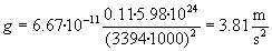 Medida de la aceleración de la gravedadCuando el ángulo q es pequeño entonces, senq » q , el péndulo describe oscilaciones armónicas cuya ecuación es q =q0·sen(w t+j ) de frecuencia angular w2=g/l, o de periodo La ley de la gravitación de Newton describe la fuerza de atracción entre dos cuerpos de masas M y m respectivamente cuyos centros están separados una distancia r. La intensidad del campo gravitatorio g, o la aceleración de la gravedad en un punto P situado a una distancia r del centro de un cuerpo celeste de masa M es la fuerza sobre la unidad de masa g=F/m colocada en dicho punto. su dirección es radial y dirigida hacia el centro del cuerpo celeste. En la página dedicada al estudio del Sistema Solar, proporcionamos los datos relativos a la masa (o densidad) y radio de los distintos cuerpos celestes. Ejemplo: Marte tiene un radio de 3394 km y una masa de 0.11 masas terrestres (5.98·1024 kg). La aceleración g de la gravedad en su superficie es Tenemos dos procedimientos para medir esta aceleración