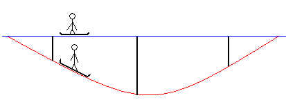 En esta página, se compara el movimiento de un esquiador que cruza un puente, con otro esquiador que cruza un valle, tal como se muestra en la figura. ¿Cuál de los dos llegará antes al otro extremo del puente?