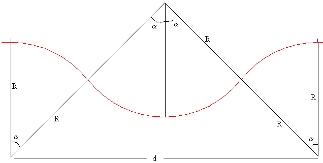 Movimiento a lo largo del valleLa forma del valle puede ser descrita por una función continua que esté por debajo del segmento de la recta que conecta el punto inicial y el punto final. En este caso, el valle lo construiremos conectando cuatro arcos de circunferencia, del mismo ángulo α y radio R, tal como se muestra en la línea de color rojo, en la figura.