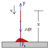 Caso particular. Cuando la fuerza F=0, la cadena cae libremente. La velocidad de caída del extremo libre es v=-g·t. La fuerza que ejerce el suelo para parar los eslabones que caen es Fs= vdm/dt=ρv2=ρg2t2 Suponemos que v=0, cuando x=L, siendo L la longitud de la cadena. En el instante t, la altura del último eslabón de la cadena es x, y una longitud L-x se encuentra en reposo sobre el suelo. La reacción N del suelo es la suma de dos términos: