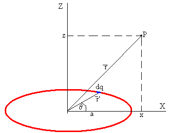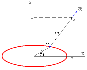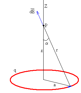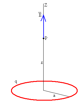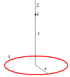 En esta página se calcula el campo eléctrico y el potencial producido por un anillo uniformemente cargado en un punto de su eje de simetría. Aplicaremos el resultado obtenido para calcular el campo y potencial producido por un disco de radio R, uniformemente cargado y finalmente, el campo producido por un plano indefinido, cuando el radio del disco se hace muy grande. Sin embargo, el campo y el potencial en un punto fuera del eje del anillo requiere el cálculo de integrales elípticas completas de primera y segunda especie. El anillo de radio a contiene una carga q uniformemente distribuida en su longitud.