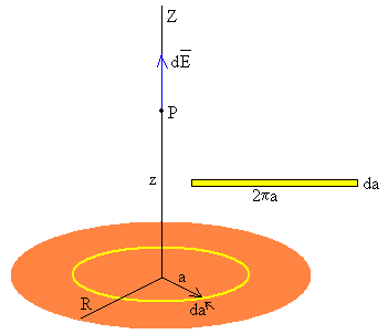 El campo total producido por el disco cargado es la suma de los campos producidos por todos los anillos que forman el disco. Para un plano indefinido cargado R→∞ El mismo resultado se obtiene aplicando la ley de Gauss.